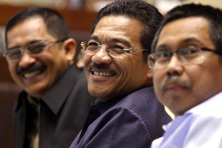 Mendagri Gamawan Fauzi (tengah) didampingi Dirjen Kesatuan Bangsa dan Politik Kementerian Dalam Negeri Tanri Bali Lamo (kiri) dan Dirjen Administrasi Hukum Umum (AHU) Kementerian Hukum dan HAM, Aidir Amin Daud menghadiri rapat kerja RUU Pemilu DPR di Gedung Parlemen, Senayan, Jakarta, (Rabu 7/3). Gamawan mendesak agar RUU Pemilu kelar bulan ini. MOHAMAD QORI/RM
