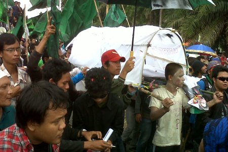Masyarakat meluapkan berbagai ekspresi dalam menolak kenaikan harga bahan bakar minyak (BBM). Salah satunya adalah apa yang dilakukan mahasiswa dari HMI saat berdemo di depan gedung DPR, Senayan, Jakarta (Kamis, 29/3). Dalam aksinya, mereka membawa keranda mayat sebagai simbol matinya hati nurani para pemimpin di negeri ini karena tega menaikkan harga BBM sedangkan masyarakat masih dalam kesusahan. RUSLAN TAMBAK/RMOL