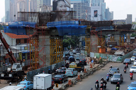 Suasana semrawut terlihat di ruas Jalan DR. Satrio, Kawasan Karet, Jakarta, kemarin. Hal ini terjadi karena adanya pembangunan jalan layang non tol Kampung Melayu- Tanah Abang. Pembangunan jalan ini diharapkan segera selesai dan bisa mengurai kemacetan. TEDY KROEN/RM