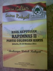 Sementara, pada halaman 24 buku hasil Rapimnas ke-II yang dibagikan di DPP Golkar tadi siang, tercantum pula Rekomendasi Bidang Pemenangan Pemilu Rapimnas II Partai Golkar tahun 2011 point 13. Ada rekomendasi penting di sana yang meminta DPP Partai Golkar segera membuat penetapan Aburizal Bakrie sebagai calon presiden dari Partai Golkar pada Pemilu Presiden 2014, melalui mekanisme partai, selambat-lambatnya pada bulan Juni 2012.