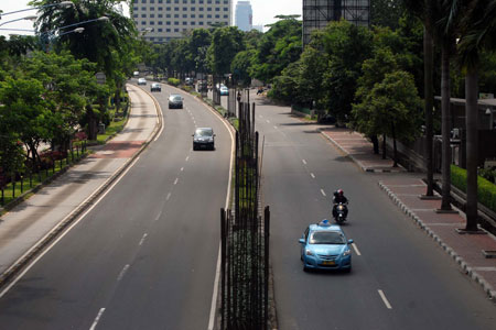 Hari libur Kenaikan Isa Al Masih dan cuti bersama membuat suasana lengang di kawasan Rasuna Said, Kuningan, Jakarta, (Sabtu 19/5). Biasanya, di kawasan ini sering macet. PUTU WAHYU RAMA/RM