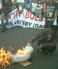 "Pocong simbol kelemahan, ketidakberdayaan dan kematian hati nurani. Sekarang kita bakar sebagai bentuk kemarahan kita terhdapan rezim," seru aktivis GAS, Fajar, dalam orasinya (Rabu, 23/5)