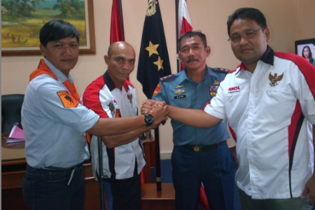 Komandan Korps Marinir Mayjen TNI (Mar) Alfan Baharudin melakukan salam komando bersama Ketua Umum TRAMP Sandhy Irawan (paling kiri), pendaki tunadaksa Sabar Gorky, dan Pemimpin Redaksi Rakyat Merdeka Online, Teguh Santosa (paling kanan) di Markas Korps Marinir, Jakarta Pusat (Jumat siang, 25/5). Alfan mendukung penuh rencana pendakian Sabar ke Pegunungan Cartenz, Jayawijaya, Papua, pada 9 September mendatang. DAR EDI YOGA/RMOL