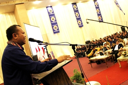 Ketua Umum DPP Partai NasDem Patrice Rio Capella menyampaikan sambutan pada pelantikan sejumlah under bouw partai yang mengusung slogan restorasi tersebut di Manado kemarin. Pada pelantikan pengurus Garda Wanita (Garnita) Malahayati dan Badan Advokasi Hukum (BAHU) Nasdem Sulawesi Utara itu, Rio menyemangati kadernya untuk memenangkan pemilihan umum 2014 mendatang. ZULHIDAYAT SIREGAR/ISTIMEWA