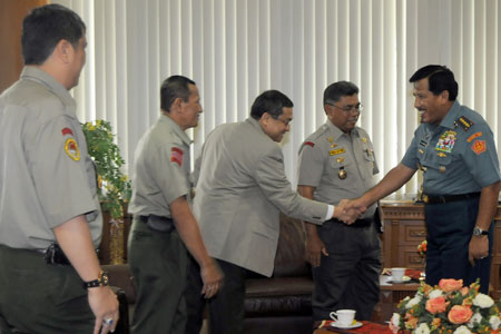 Panglima TNI Laksamana Agus Suhartono (kanan) menerima Ketua Umum Forum Komunikasi Putra-Putri Purnawirawan (FKPPI) Ponco Sutowo (kedua kanan) dan Ketua Umum HIPWI-FKPPI Hariara Tambunan (kiri) di Mabes TNI Cilangkap Jakarta. FKPPI mengundang Panglima TNI dalam pelantikan pengurus HIPWI 10 Juni 2012. DWI PAMBUDO/RM