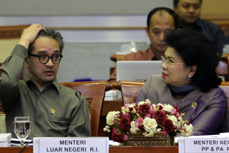 Menteri Pemberdayaan Perempuan dan Pelindungan Anak Linda Gumerlar (kanan) bersama Menlu Marty Natalegawa mengikuti rapat kerja di Gedung DPR, Jakarta, (Rabu 6/6). Raker membahas RUU tentang Pengesahan Optional Protocol to the Convention on the Rights of the Child on the Involvement of Children in Armed Conflict atau Protokol Opsional Konvensi Hak-hak Anak mengenai keterlibatan anak dalam konflik bersenjata. TEDY KROEN/RM