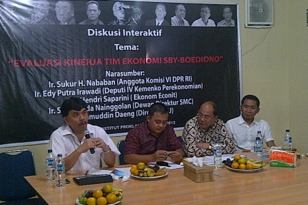 Ketua Dewan Direktur Lembaga Kajian Publik Sabang-Merauke Circle (SMC), Syahganda Nainggolan; Ketua PMII Syukron (moderator); Staf Ahli Menko Perekonomian Bidang Persaingan Usaha, Supriyadi; serta peneliti Institute Global for Justice, Salamuddin Daeng (kiri ke kanan) tampil sebagai pembicara dalam diskusi Evaluasi Kinerja Tim Ekonomi SBY-Boediono yang diadakan Institut Proklamasi di Jakarta, Senin (18/6). Dalam kesempatan itu, Syahganda mengungkapkan, pemerintahan SBY menampilkan fokus yang mendua dalam menjalankan politik pembangunan ekonomi nasional. ZULHIDAYAT SIREGAR/IST