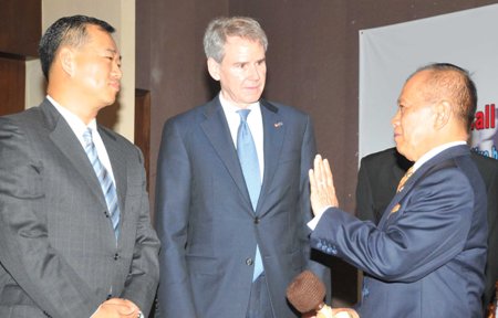 (kanan) berbincang dengan Ambassador US Mision to ASEAN David L Carden