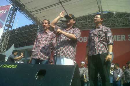 Ketua Dewan Pembina Partai Gerindra, Prabowo Subianto (tengah) didampingi Jokowi Widodo dan Basuki T. Purnama kompak memakai kemeja kotak-kotak dalam kampanye pasangan Jokowi-Ahok di GBK, Senayan, Jakarta (Minggu, 1/7). Dalam kesempatan itu, Prabowo menegaskan akan mengerahkan kekuatan memenangkan pasangan yang didukung PDI Perjuangan dan Partai Gerindra itu. RUSLAN TAMBA/RMOL