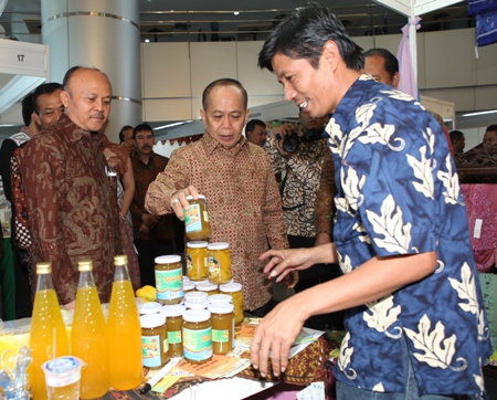 Menkop dan UKM Syarief Hasan meninjau produk OVOV pada acara Temu Nasional Pengembangan Produk Unggulan Desa, One
