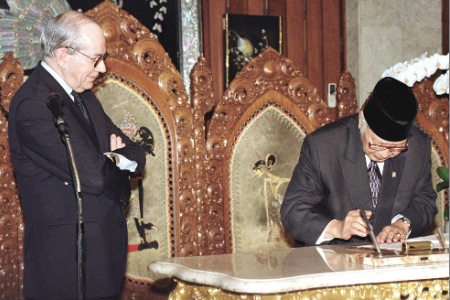 Presiden Soeharto menunduk menandatangani kesepakatan dengan International Monetary Fund (IMF) pada 15 Januari 1998. Sementara Managing Director IMF Michel Camdessus yang berdiri di sebelahnya menyaksikan sambil bersidekap. Dalam kesepakatan dengan IMF itu penguasa Soeharto sepakat untuk menghapuskan monopoli, mencabut subsidi untuk rakyat dan menghapuskan sejumlah proyek nasional yang dinilai merugikan keuangan negara karena berbau KKN. Adegan inilah yang antara lain mendorong pemerintah SBY, seperti disampaikan Menko Perekonomian Hatta Rajasa, bersedia memberikan pinjaman sebesar 1 miliar dolar AS kepada IMF yang sedang dirudung masalah keuangan. FOTO REPRO REUTERS