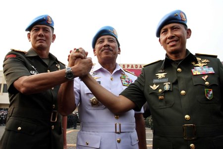 Panglima TNI Laksamana Agus Suhartono (tengah) bertindak selaku Inspektur Upacara pada upacara serahterima tugas dan tanggung jawab jabatan Komandan Pasukan Pengamanan Presiden (Danpaspampres), dari pejabat lama Mayjen TNI Agus Sutomo (kanan) kepada penggantinya Brigjen TNI Doni Munardo (kiri) di Lapangan Upacara Mako Paspampres, Tanah Abang II Jakarta Pusat, Rabu (25/7).