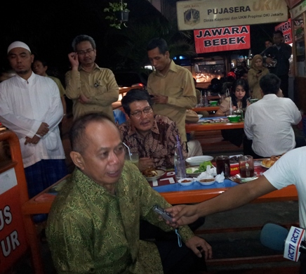 Menteri Koperasi dan UKM Syarief Hasan didampingi Deputi Pemasaran dan Jaringan Usaha Kemenkop dan UKM Neddy Rafinadi (berkacamata) saat berbuka puasa di Pujasera Pedagang Kaki Lima (PKL) Blok S Jakarta. Dalam kesempatan itu, Syarief yakin PKL blok S bisa naik kelas menjadi UKM. DEDE ZAKI MUBAROK/RMOL