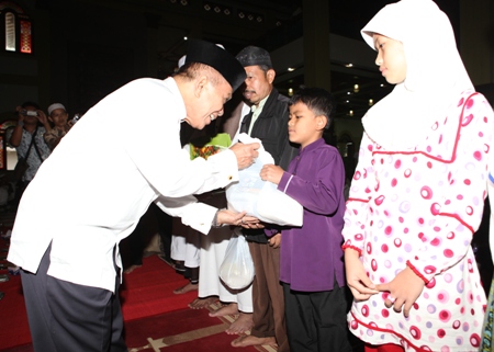 Rangkaian Safari Ramadhan Menteri Koperasi dan UKM Syarief Hasan berpbuka puasa bersama dengan masyarakat Cianjur yang dipusatkan di Masjid Agung Cianjur, Minggu (29/07). Dalam Kesempatan itu, Menkop dan UKM memberikan Paket Sembako kepada yatim piatu dan kaum Duafa. DEDE ZAKI MUBAROK/RMOL