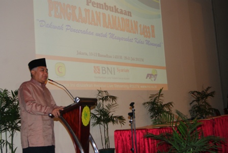 Ketua Umum PP Muhammadiyah Din Syamsuddin menyampaikan sambutan dalam pembukaan pengajian Ramadhan Pimpinan Pusat Muhammadiyah Ahad (29/7) di Aula Rumah Sakit Islam, Cempaka Putih, Jakarta. Tema pengajian ini adalah Strategi Dakwah di Kalangan Menengah. ZULHIDAYAT SIREGAR/RMOL