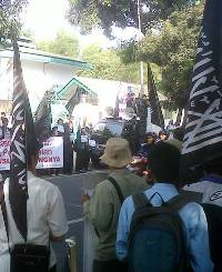 "SBY sebagai kepala penguasa negara muslim terbesar di dunia, SBY harus memiliki tanggung jawab membela dan menolang umat muslim di dunia," ujar Ketua DPP HTI, Rohmat S. Labib di depan Kedubes Myanmar, Jakarta Pusat, Jumat, (3/8).