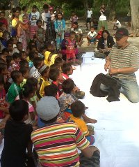 Saat itu mereka memang sedang mendengarkan dongeng dari Gerakan Para Pendongeng untuk Kemanusiaan (GePPuK). Sambil memperkenalkan diri, sebanyak 10 para pendongeng dan seorang pendongeng cilik, mengocok perut warga Pulau Tunda tersebut.