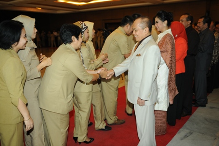 Menteri Koperasi dan UKM Syarief Hasan didampingi istrinya Ingrid Kansil  ber-halal bihalal dengan pejabat dan staff Kemenkop dan UKM di kantor, Jl. H.R. Rasuna Said Kav. 3-5 Kuningan Jakarta 12940, kemarin.DEDE ZAKI MUBAROK