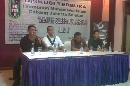 Dari kiri ke kanan: staf pengajar politik UIN Jakarta Teguh Santosa, Ketua Umum PB HMI Noer Fajriansyah, dan Ketua Panwaslu DKI Jakarta Ramdansyah menjadi narasumber dalam diskusi yang digelar oleh HMI Cabang Jakarta Selatan. Acara yang dilaksanakan di Galeri Caffe, Taman Ismail Marzuki (TIM), Cikini, Jakarta pusat ini (Kamis, 6/9) ini bertemakan Memilih Gubernur Jakarta Jilid II. RUSLAN TAMBAK/RMOL