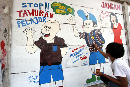 Seorang pemuda menyelesaikan pembuatan mural bertuliskan "Stop Tawuran Pelajar" di kawasan Kawikawi bawah, Johar Baru, Jakarta, (Minggu 30/9). Dia prihatin tawuran menimbulkan korban jiwa. M IQBAL ICHSAN/RM