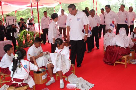Presiden SBY saat meninjau perlombaan cipta seni yang berlangsung di Kawasan Hutan Lindung, Istana Cipanas, Cianjur, Jawa Barat, Senin (10/8). Lomba meliputi berbagai cabang seni, seperti melukis, menulis dan membaca puisi, dan menyanyi diikuti pelajar setingkat SD, SMP, dan SMA se-Indonesia. RANDY TRI KURNIAWAN/RM