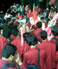 Puluhan mahasiswa dari Ikatan Mahasiswa Muhammadiyah Cabang Ciputat menggelar unjuk rasa di depan gedung Komisi Pemberantasan Korupsi, Jalan HR Rasuna Said Kuningan, Jakarta Selatan siang tadi (Jumat, 12/10).