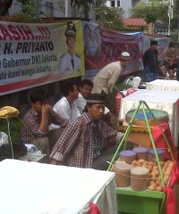 Tapi tunggu dulu, makanan gratis yang disiapkan Timses Jokowi-Ahok ini belum bisa dinikmati, karena ada jadwalnya. PKL yang dekat dengan Gedung DPRD akan dibuka pukul 10.00 WIB dan 11.00 WIB. Sedangkan PKL yang berada di seberang jalan akan dibuka pukul 12.00 WIB.