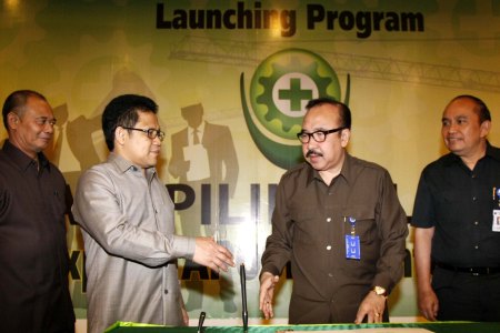 Dari kiri: Dirjen Pembinaan Pengawasan Ketenaga kerjaan Kemnakertrans, Muji Handoyo, Menakertrans Muhaimin Iskandar, Sekjen Menakertrans, Muchtar Luthfi dan Direktur Jenderal Pembinaan Hubungan Industril Kemenakertrans, Irianto Simbolon usai Penandatanganan Program Berbudaya K3 "Saya Pilih Selamat" di gedung Kemenakertrans Jakarta, Selasa (16/10). Dewan K3 Nasional bekerjasama dengan Kemenakertrans dan Convex8 meluncurkan Program Sosialisasi K3 yang bertujuan untuk menurunkan angka kecelakaan kerja. DWI PAMBUDO/RM