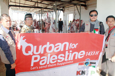 Dari kiri, Salah satu Mudhohy (pengkurban) Ketua Bazda Agam, Padang Sumatera Barat Yandril, ikut menyaksikan proses penyembelihan hewan kurban pada program Qurban for Palestine di Gaza Palestina, didampingi Wakil Sekjen KNRP Caca Cahayaningrat, Direktur Program KNRP Ali Amril dan salah satu personil tim nasyid Izzatul Islam dalam acara pelaksanaan program Qurban for Palestine Komite Nasional untuk Rakyat Palestina (KNRP) dilakukan di Khan Younis, Gaza Palestina, di lokasi Muharroroh Hithin (tanah yang dibebaskan oleh pejuang Palestina), kemarin. Total hewan kurban yang disembelih yaitu 21 ekor sapi dan 53 ekor kambing, senilai Rp 600 juta, selain itu KNRP juga memberikan donasi untuk rakyat Palestina melalui Partner for Peace & Development for Palestinians (PPDP). JPNN