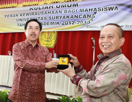 Menteri Koperasi dan UKM Syarief Hasan menerima kenang-kenangan dari Rektor Universitas Suryakancana Cianjur seusai memberikan kuliah umum dengan tema Peran Kewirausahaan bagi Mahasiswa di aula serba guna Universitas Suryakancana Cianjur, kemarin. DEDE ZAKI MUBAROK/RMOL