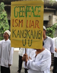 Dua pocong digantungkan ratusan orang yang tergabung dalam Majelis Taklim Barisan Pemuda Salafunassholeh Ahlussunah Wal Jama`ah (Barda Salama) dalam demonstrasi menentang Greenpeace di depan kantor Greenpeace , alan KH Abdullah Syafei, Tebet, Jakarta Selatan, Kamis siang (8/11).Dua pocong itu menggambarkan Kepala Juru Kampanye Hutan Greenpeace Indonesia, Bustar Maitar, dan Direktur Eksekutif Greenpeace Internasional, Kumi Naidoo.