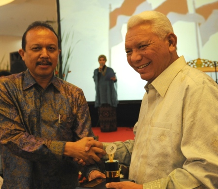 Sekretaris Kementerian Koperasi dan UKM, Agus Muharam, menyerahkan penghargaan pemerintah daerah pengayom usaha kecil dan menengah kepada Gubernur Kalimantan Timur Awang Faruk. Penghargaan diserahkan dalam acara Gebyar IPPKINDO EXPO 2012, di SME TOWER Pancoran Jakarta Selatan, sesaat lalu. DEDE ZAKI MUBAROK/RMOL