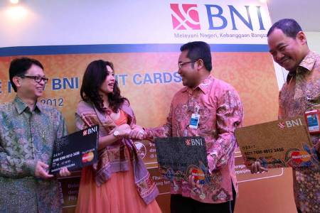 (dari kiri) Direktur Konsumer dan Retail Bank BNI Darmadi Sutanto, Country Manager Master Card Worldwide Indonesia Irni Palar, General Manager Divisi Consumer Management & Marketing Bank BNI Purnomo B Soetadi dan General Manager Divisi Bisnis Kartu BNI Dodit Progojakti menunjukan Varian Baru Kartu Debit BNI, saat diluncurkan di Jakarta, Jum'at ( 7/12). Bank BNI menerbitkan tiga varian Kartu Debit sekaligus yang berlogo Logo MasterCard yaitu Kartu Debit Gold dan Platinum untuk pemegang Taplus BNI serta Kartu Platinum untuk pemegang Taplus Bisnis, sebagai langkah awal lahirnya kartu BNI yang berdesain lebih interaktif dan menjunjung budaya negeri dengan membubuhkan motif Batik khas Cirebon sekaligus juga memberikan kebebasan bagi nasabah untuk bertransaksi. TEDY KROEN/RAKYAT MERDEKA