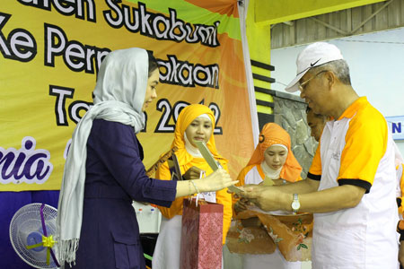 Inggrid Kansil mewakili Solidaritas Istri Kabinet Indonesia Bersatu (SIKIB) menerima penghargaan dari Bupati Sukabumi Sukmawijaya dalam rangka Pekan Hari Baca dan Hari Kunjungan Ke Perpustakaan Kabupaten Sukabumi 2012 di Sukabumi, Minggu, (9/12). Penghargaan ini sebagai tanda atas peran aktif SIKIB mendukung budaya membaca bagi generasi muda di Kabupaten Sukabumi. JPNN
