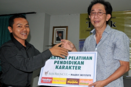 Bantuan diterima Direktur Eksekutif Maarif Institute, Fajar Riza Ulhaq. Program pendidikan karakter bagi guru dilaksanakan selama tiga hari yang berakhir Minggu (9/12). ISTIMEWA
