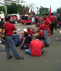Aksi KASBI itu sempat membuat arus lalu lintas dari arah Tugu Tani menuju Medan Merdeka Utara tersendat.