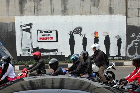 Mural "Anti Korupsi" menghiasi dinding Jembatan Layang, di ruas jalan Arteri, Kawasan Kebayoran Lama, Jakarta, Rabu (12/12). Lukisan Mural yang memperlihatkan "Antrean Koruptor" dengan berbagai rupa menunggu saat-saat eksekusi ini merupakan bentuk kepercayaan, dukungan sekaligus harapan yang ditujukan oleh elemen masyarakat kepada aparat penegak hukum yang dalam rangka memberantas korupsi tanpa pandang bulu. TEDY KROEN/RAKYAT MERDEKA