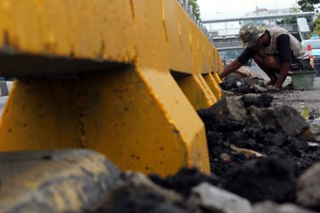 Pekerja sedang mengerjakan peninggian pembatas jalur Bus Trans Jakarta koridor Kampung Melayu-Ancol di ruas Jalan Matraman Raya Jakarta Pusat, Kamis (13/12). Peninggian pembatas ini dilakukan selain untuk mencegah kendaraan non TransJakarta memasuki jalur juga agar mengindarai kecelakaan akibat para pejalan kaki yang menyeberang langsung dan tidak melalui jembatan Penyeberangan Orang (JPO). TEDY KROEN/RAKYAT MERDEKA
