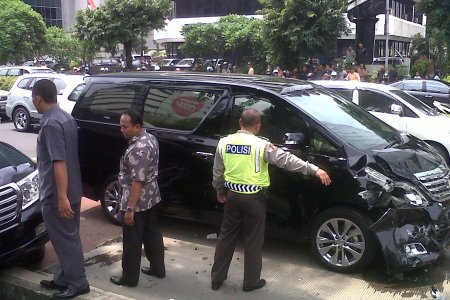 Alpard B 326 CJ. Parahnya lagi dua mobil ini tabrakan di jalur Busway. RUSLAN TAMBAK/RMOL