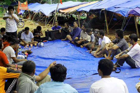 Petani-petani Jambi yang mengungsi ditenda berdiskusi soal reformasi agraria di tenda yang didikran di Depan Kementerian Kehutanan, Jakarta, Senin (24/12). Mereka menuntut dikembalikannya tanah pemukiman di Kampung Kunang Jaya, Mekar Jaya, dan Suku Anak Dalam di Jambi yang telah diambil perusahaan swasta. KHAIRIZAL ANWAR/RAKYAT MERDEKA