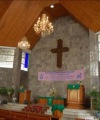 Altar gereja Kernolong berhias rangkaian bunga, terdapat salib besar menempel pada dinding tengah, dan kacanya bercorak warna warni yang terlihat seperti motif ulos dari Batak.