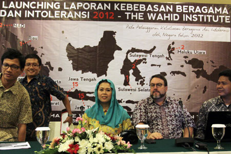 Direktur Wahid Institute, Yenny Wahid diapit empat pria saat memaparkan laporan kebebasan beragama dan toleransi tahun 2012, di Jakarta, (Sabtu 28/12). WAHYU DWI NUGROHO/RM