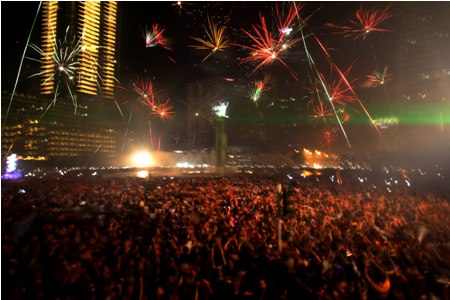 Ribuan warga Jakarta merayakan pesta kembang api di kawasan Bundaran Hotel Indonesia (HI), Jakarta, saat malam pergantian tahun baru 2013, Selasa (1/1) dini hari. Ribuan masyarakat diguyur hujan, bersuka cita memadati kawasan Bundaran HI untuk menyaksikan pesta kembang api dan Jakarta Night Festival dalam rangka menyambut datangnya tahun baru 2013. DWI PAMBUDO/RM