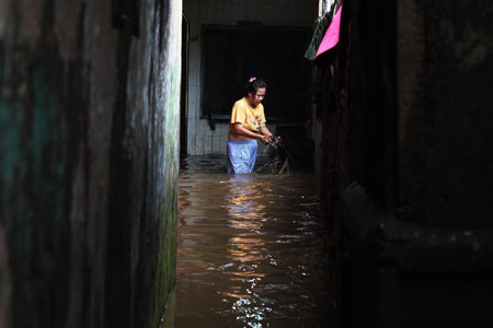 Warga Kampung Pulo, Jakarta, mencuci pakaian di depan rumahnya yang terendam banjir, (Sabtu 2/2). Sebelumnya, banjir daerah ini sudah surut, tapi karena kali Ciliwung meluap, banjir kembali merendam.