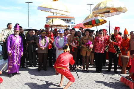 Menteri Koperasi dan UKM Syarief Hasan didampingi Ibu Inggrid Syarief Hasan, disambuat acara adat saat tiba di pelabuhan Siau Kabupaten Kepulauan Siau Propinsi Sulawesi Utara. Menkop dan rombongan hadir dalam rangka Penganugrahan Gelar Adat pada acara Pesta adat Tulude pada 1 Februari lalu. Pada kesempatan itu, Inggrid Syarief Hasan dianugrahkan gelar adat "Muntia Simenang Mehengke Nusa" (Mutiara Cemerlang Pembawa Kemajuan Negeri). [RMOL]