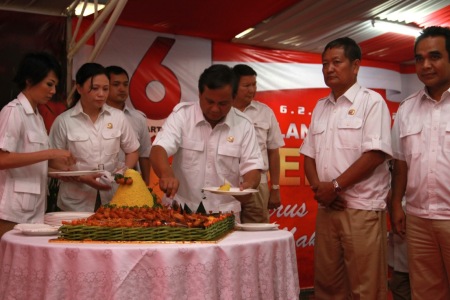Ketua Dewan Pembina DPP Gerindra Prabowo Subianto (tengah) memotong tumpeng pada acara "Syukuran HUT ke 5 Gerindra" di Kantor DPP Partai Gerindra, Jalan RM Harsono, Jakarta Selatan (Rabu, 6/2). Turut mendampingi Ketua Umum DPP Gerindra Prof. Suhardi (kedua dari kanan) dan Sekjen Gerindra Ahmad Muzani (paling kanan). FACEBOOK.COM/GERINDRA