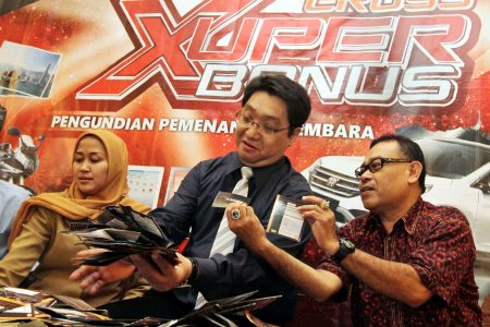 Notaris Cross Mobilephone Abdul Rozak Rahman, Direktur Marketing Cross Mobilephone Janto Djojo dan Dinas Sosial DKI Jakarta Herwy (kanan ke kiri) saat mengundi ratusan kartu garansi peserta Cross Xuper Bonus berhadiah Mobil CRV Serta Ratusan Hadiah XUPER Lainnya di Jakarta, Selasa (12/2). DWI PAMBUDO/RM