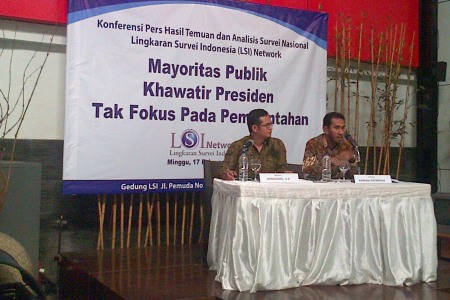 Peneliti Lingkaran Survei Indonesia (LSI) M. Barkah Pattimahu (kanan) membeberkan hasil survei di kantornya, Jalan Pemuda Jakarta, Minggu (17/2). Dalam survei itu terungkap, mayoritas masyarakat Indonesia khawatir Presiden SBY tidak fokus urus negara karena mengambil alih wewenang Ketua Umum Partai Demokrat, yang dijabat Anas Urbaningrum. WAHYU SK/RMOL