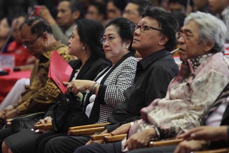 Ketua MPR Taufiq Kiemas, Sekjen DPP PDIP Tjahjo Kumolo, Ketua Umum DPP PDIP Megawati Soekarnoputri, dan Ketua Fraksi Puan Maharani hadir dalam Seminar Nasional "Migas Untuk Kemandirian Energi" di Gedung DPR, Jakarta, Rabu (27/2). Seminar ini mengupas berbagai persoalan mengenai penguasaan Blok-blok Migas yang sebagian besar dikuasai asing ini, sebagai masukan sekaligus acuan dalam penyusunan draft RUU Migas yang oleh Fraksi PDIP disebut RUU Merah Putih, agar kedepan Kedaulatan Migas yang menjadi impian Nasional dapt terwujud. TEDY KROEN/RAKYAT MERDEKA