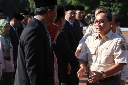 Menteri Kehutanan Zulkifli Hasan memberikan penghargaan kepada Pegawai Negeri Sipil (PNS) berprestasi di lingkungan Kementerian Kehutanan di Plaza Kemenhut, Gedung Manggala Wanabakti, Jakarta, Senin (18/3). Pemberian penghargaan dalam rangka memperingati puncak Hari Bakti ke 30. DWI PAMBUDO/RM